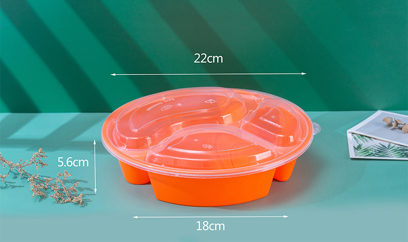 Product model: 838 three round lunch box orange Product specification: 22*5.6*18cm Product material: food grade PP (non-toxic environmental protection Box Color: Orange Product advantages: high temperature resistance, not easy to drip, anti stack, easy to extract Quantity per box: 150 sets