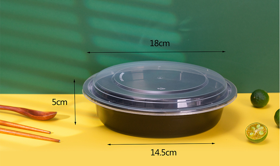 Product model: export 24 oz round bowl 1X150 sets (black) Product specifications: 18*5*134.5cm Product material: food grade PP (non-toxic, environmentally friendly) Box Color: Black Withstand temperature: 110 ℃/-18 ℃ Quantity per box: 1X150 sets